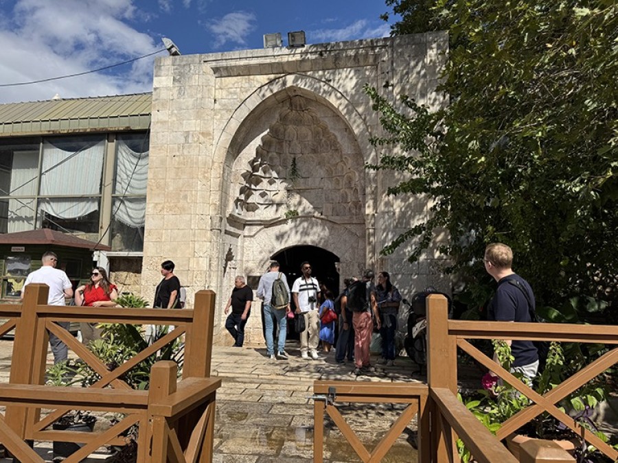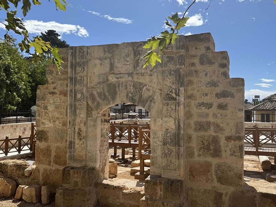 Ziyaretçiler, yine alanda Atabey Armağan Medresesi'nden bugüne kalan "taç kapı" çevresinde dokuya uygun yapılan yürüyüş yolunu takip ederek Selçuklu mimarisi tarihi kapının önünde fotoğraf çektiriyor.
