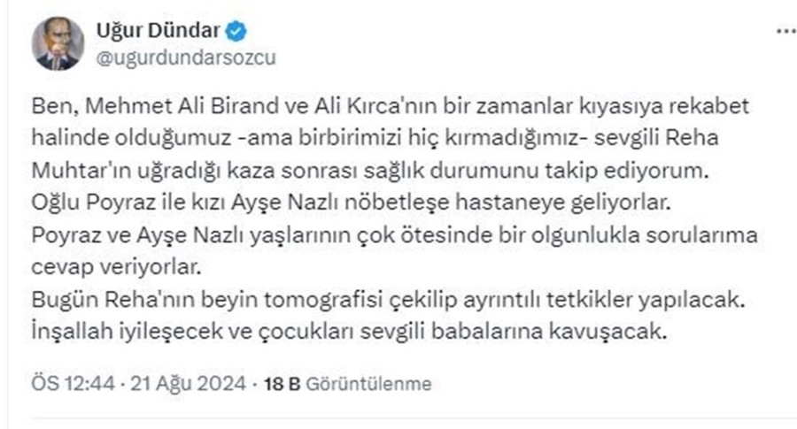 "Ben, Mehmet Ali Birand ve Ali Kırca'nın bir zamanlar kıyasıya rekabet halinde olduğumuz -ama birbirimizi hiç kırmadığımız- sevgili Reha Muhtar'ın uğradığı kaza sonrası sağlık durumunu takip ediyorum.