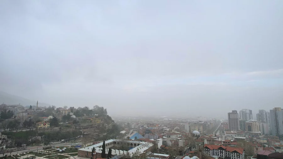 Bursa'nın Osmangazi ilçesi ve çevre ilçelerde sabah saatlerinden itibaren etkili olan sis, kentin yüksek kesimlerinden şehir merkezine doğru ilerliyor.