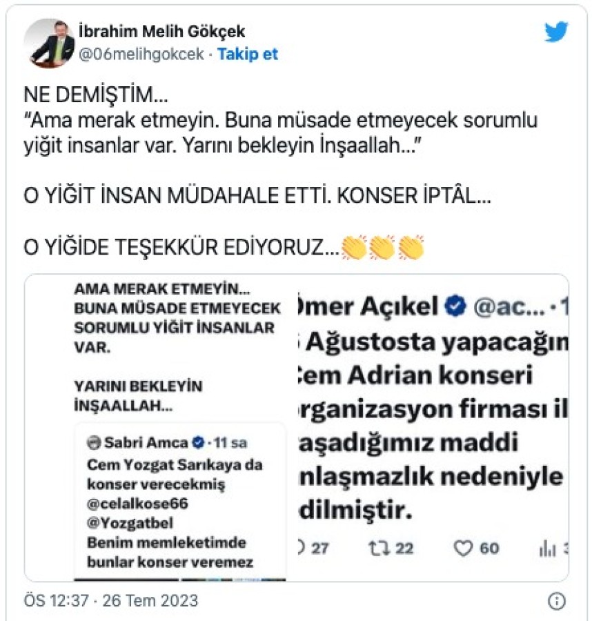 Gökçek, konserin iptal edilmesine sevindiğini ifade eden şu paylaşımı yaptı: