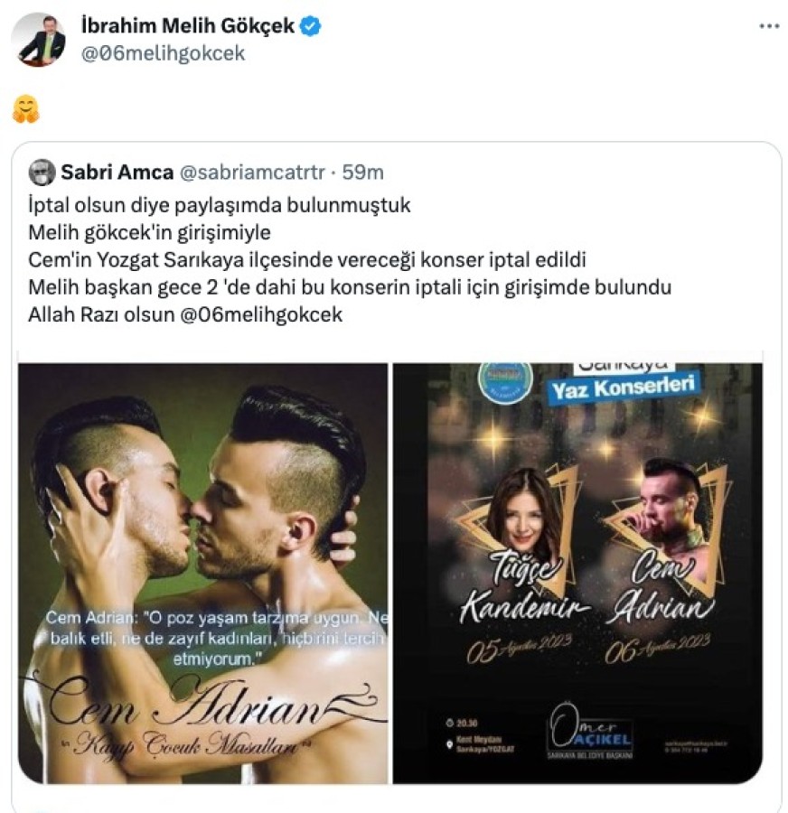 Gökçek'in paylaşımından bir gün sonra ise Sarıkaya Belediye Başkanı Belediye Başkanı Ömer Açıkel, konserin iptal edildiğini duyurdu. Başkan Açıkel, "6 Ağustos'ta yapacağımız Cem Adrian konseri organizasyon firması ile yaşadığımız anlaşmazlık nedeni ile iptal edilmiştir" ifadelerini kullandı.