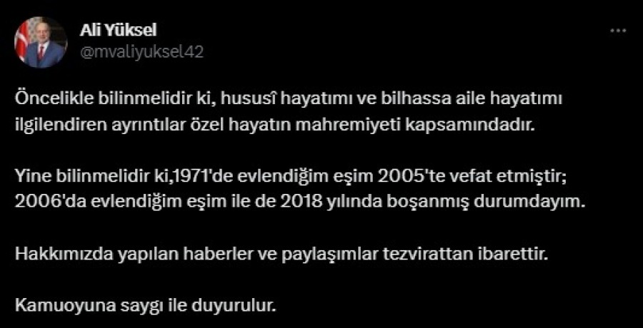 "Öncelikle bilinmelidir ki, hususî hayatımı ve bilhassa aile hayatımı ilgilendiren ayrıntılar özel hayatın mahremiyeti kapsamındadır. Yine bilinmelidir ki,1971'de evlendiğim eşim 2005'te vefat etmiştir; 2006'da evlendiğim eşim ile de 2018 yılında boşanmış durumdayım. Hakkımızda yapılan haberler ve paylaşımlar tezvirattan ibarettir. Kamuoyuna saygı ile duyurulur."