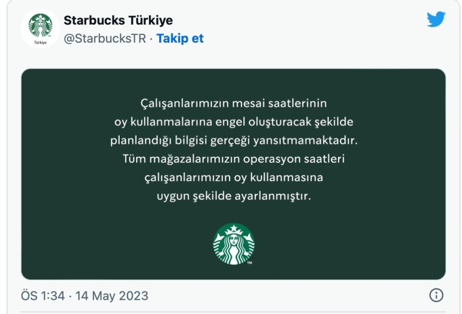 Starbucks kahve zincirinin çalışanlarının mesai saatlerinin seçimde oy vermeye uygun bir şekilde düzenlenmediğine ilişkin iddialar sosyal medyada yer almıştı. Starbucks Türkiye, buna ilişkin Twitter'dan bir açıklama yayımladı.