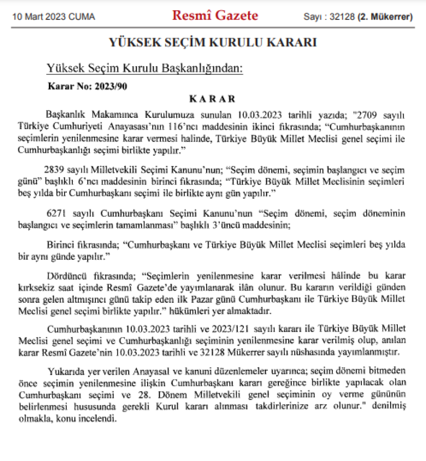 Resmî Gazete'de tebliğ edilen YSK kararına göre, seçim tarihi 14 Mayıs'ta ikinci tura kalırsa 28 Mayıs'ta yapılacak.