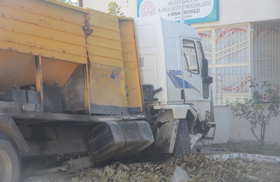 Bilecik'te freni tutmayan asfalt malzemesi yüklü kamyon E-Sınav Merkezi binası bahçesine dalarken, kaza anı bir apartmanın güvenlik kamerasına yansıdı.