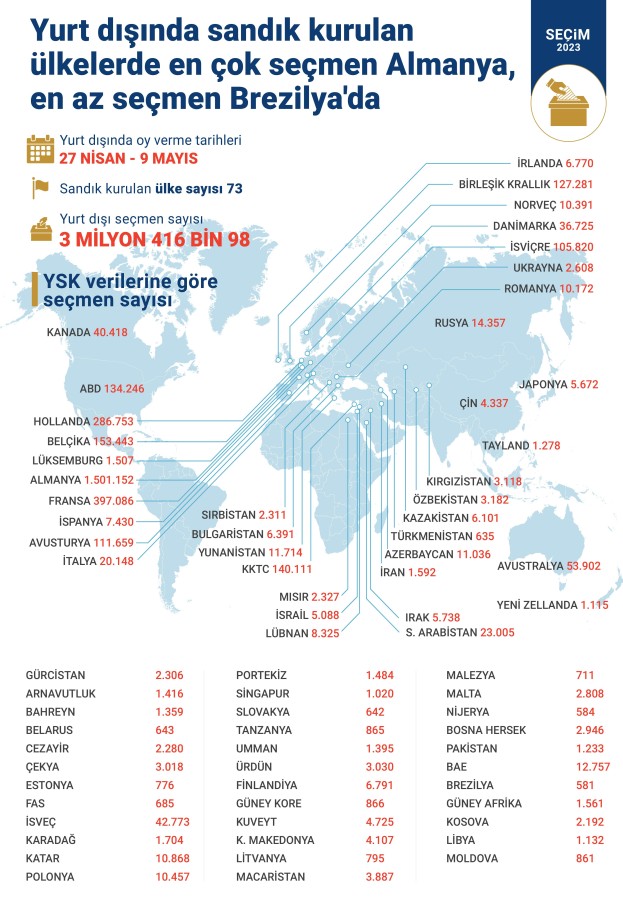 Sandık kurulacak ülkeler arasında en az seçmen sayısına sahip ülkeler ise 581 ile Brezilya, 584 seçmenle Nijerya, 635 seçmenle Türkmenistan olarak sıralandı.