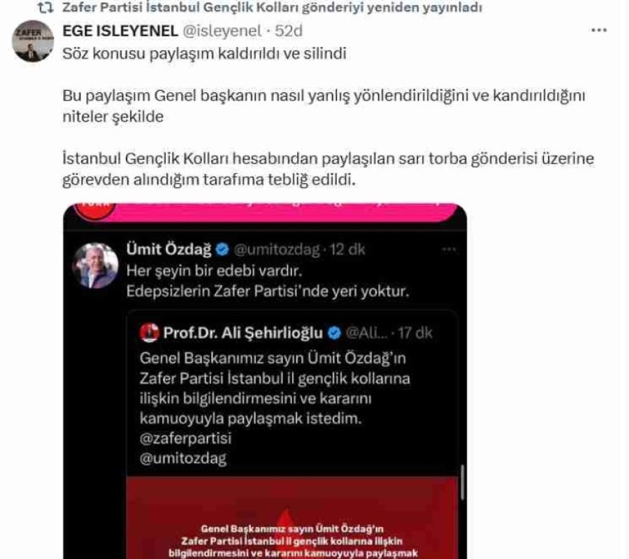 Zafer Partisi'nden konuya ilişkin yapılan açıklamada, "Bu sorumsuz davranış hakkında iç denetim süreci derhal başlatılmıştır" ifadeleri kullanıldı.