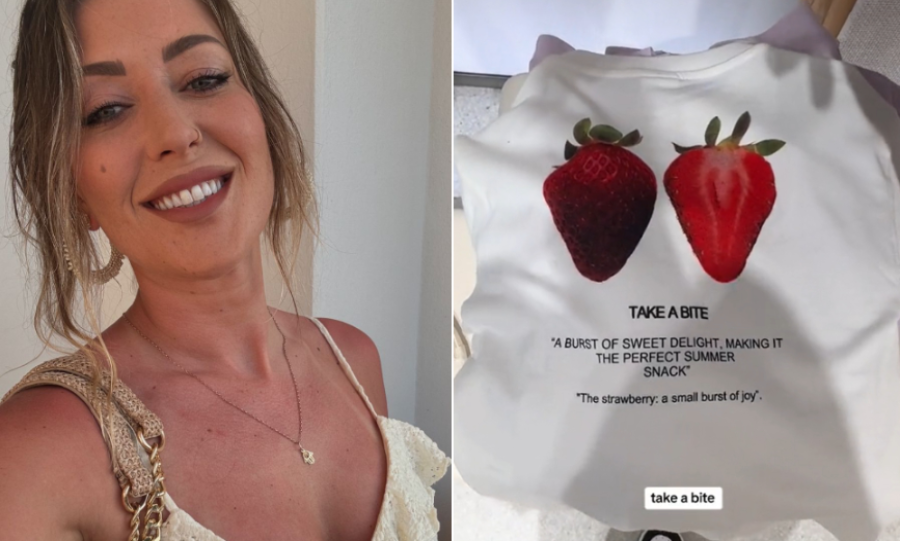 Tişörtün ön yüzünde "Mükemmel atıştırmalık" yazıyor. Arka yüzünde ise ikiye bölünmüş bir çilek ile "Bir ısırık al" ve "Onu mükemmel bir yaz atıştırmalığı yapan tatlı bir zevk patlaması" ifadeleri yer alıyor.