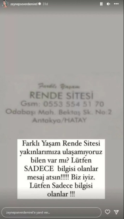Yakınlarına ulaşamadıklarını dile getiren Zeynep Sever Demirel, "Farklı Yaşam Rende Sitesi yakınlarımıza ulaşamıyoruz. Bilen var mı? Lütfen SADECE bilgisi olanlar mesaj atsın! Biz iyiyiz. Lütfen sadece bilgisi olanlar!!!" şeklinde paylaşım yaptı.