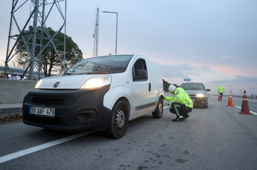 Kırklareli Emniyet Müdürlüğü Bölge Trafik Denetleme Şubesi ekipleri, kentin giriş ve çıkış noktalarında ticari araçların kış lastiklerini kontrol etti.