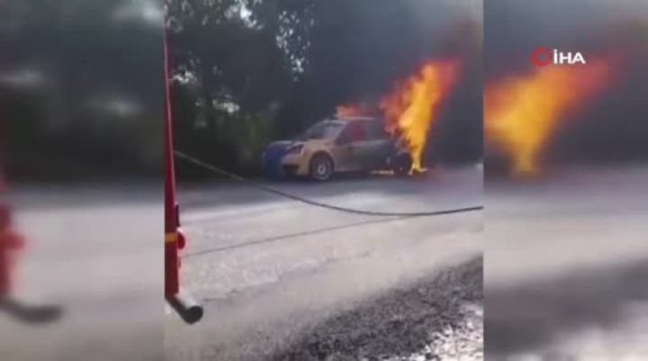 Bursa'nın Gemlik ilçesinde düzenlenen Türkiye Tırmanma Şampiyonası'nda arıza yapan yarış otomobili, alev topuna döndü. İtfaiye ekiplerince söndürülen ralli aracının sürücüsü alevlerden herhangi bir yara almadan kurtulurken, otomobil kullanılamaz hale geldi.