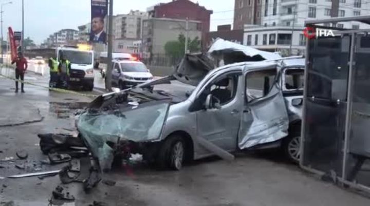 Bursa'da yağışlı havanın etkisiyle sürücüsünün kontrolünden çıkan hafif ticari araç önce bir iş yerinin demir kapısına, ardından önündeki otomobile çarptı. Çarpışmanın etkisiyle ikiye bölünen araçtaki 2 kişi hayatını kaybederken, 1 kişi de yaralandı.