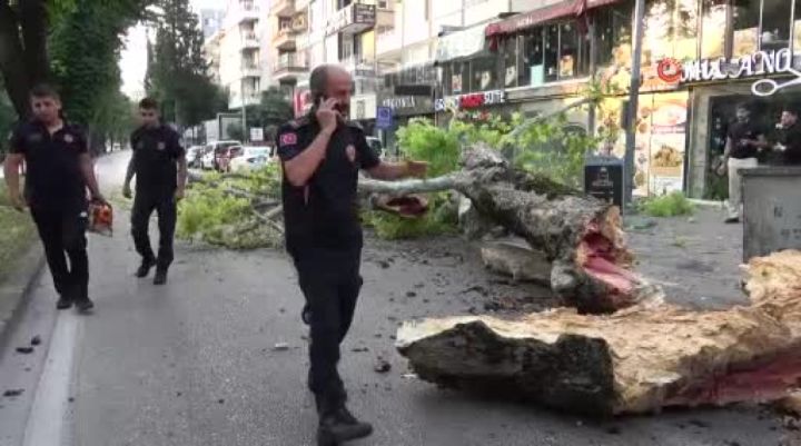 Bursa'da dev çınar ağacı kökünün çürümesi nedeniyle Çekirge Caddesi'ne devrildi. Cadde üzerinden kimsenin geçmemesi için trafik durduruldu.