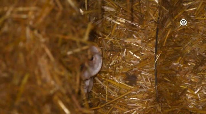 Bursa'nın Karacabey ilçesindeki bir çiftliğin samanlığına yuva yapan peçeli baykuş ailesi görüntülendi.