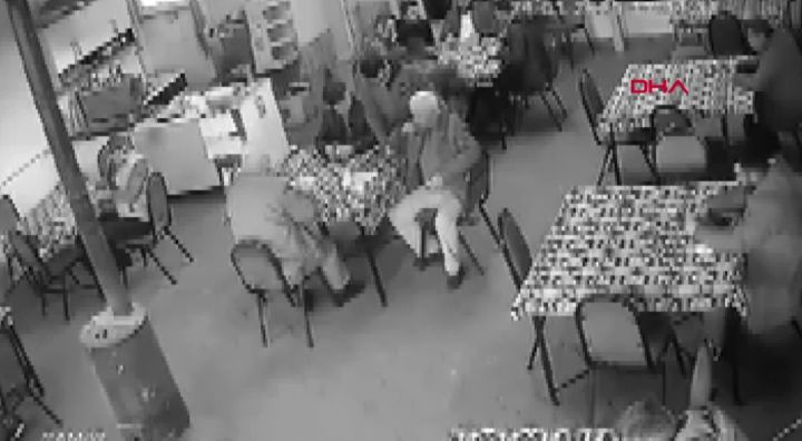 Bursa'da kahvehanede çay içtiği sırada nefes borusuna cisim kaçan kişi, yakınında bulunanlardan biri tarafından 'Heimlich manevrası' ile kurtarıldı. O anlar, güvenlik kamerasına anbean yansıdı.