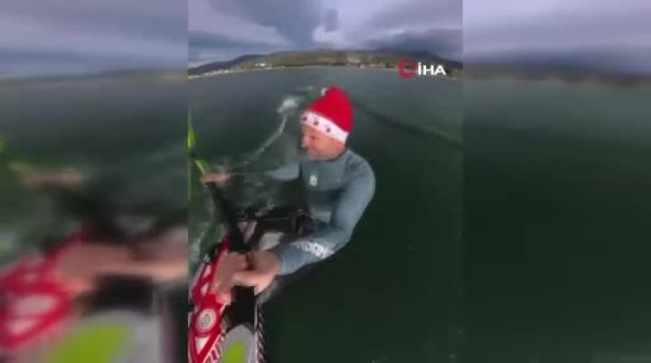 Bursa'nın İznik ilçesinde yelken antrenörlüğü yapan Mustafa Öncü'nün soğuk havaya aldırmadan gölde yaptığı sörf görüntüler oluşturdu.