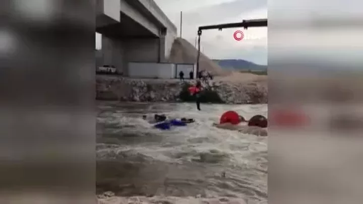Bursa Yenişehir'de dereyi traktörle geçmek isteyen 10 işçi, aracın devrilmesiyle mahsur kaldı. İşçiler ekiplerin vinç destekli çalışmasıyla kurtarldı.