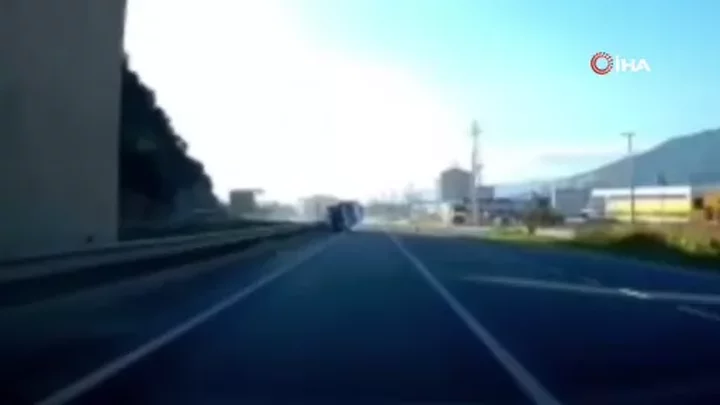 Bursa'da şehirlerarası yolda direksiyon hakimiyetini kaybeden minibüs, orta refüje çarptıktan sonra yan yatarak karşı şeride geçti. Yaşanan korku dolu anlar araç kamerasına anbean yansıdı.