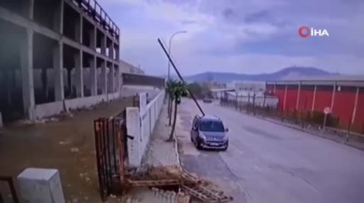 Bursa'da şiddetli rüzgarın uçurduğu çelik ticari aracın tavanına ok gibi saplandı. O anlar kameraya anbean yansıdı.