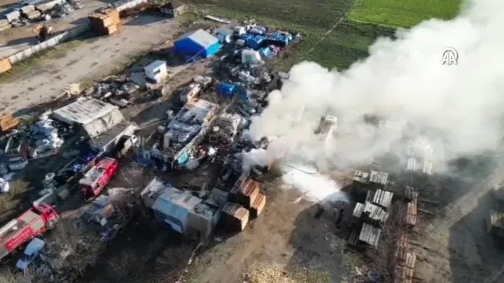 Bursa'nın İnegöl ilçesinde faaliyet gösteren bir geri dönüşüm (hurdacı) tesisinde yangın çıktı. Yangın havadan görüntülendi.