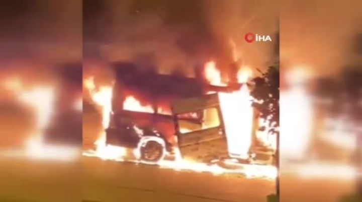 Bursa'da park halinde cayır cayır yanan servis minibüsündeki yangın, otoparktaki diğer araca da sıçradı. İtfaiye ekiplerinin söndürdüğü iki araç kullanılamaz hale geldi.