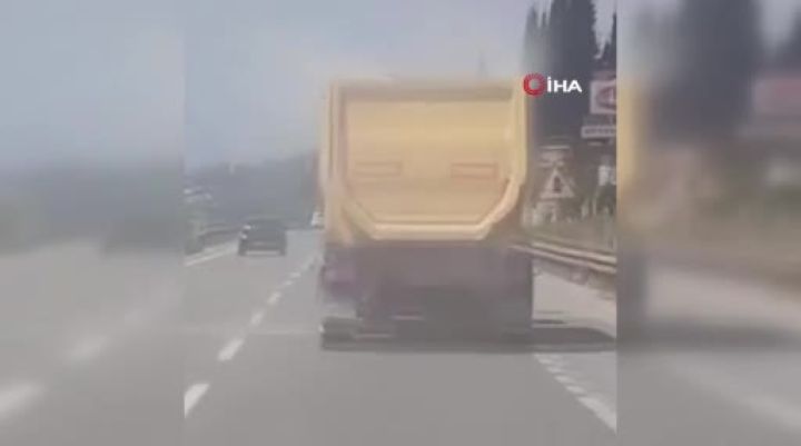 Bursa'da bir kamyonun dorsesinde yüklü olan kumlar, rüzgarın etkisiyle yola döküldü. Trafiği tehlikeye atan kamyon sürücüsü kameraya yansıdı.