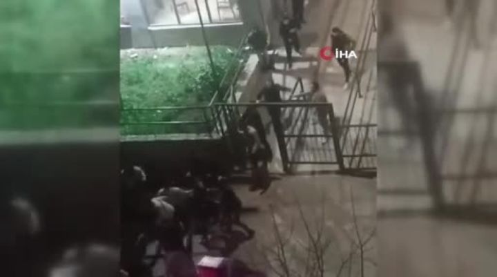 Bursa'da bir öğrenci yurdunun önünde gençler arasında çıkan kavgada tekme ve yumruklar havada uçuştu. O anlar cep telefonu kamerasına kaydedilirken, kavgayı yine çevredeki gençler ayırdı.