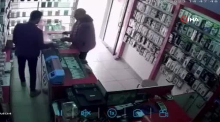 Bursa'da telefon almak için girdiği dükkanda beğendiği telefonu almak için nakit parasının olmadığını söyleyen şahıs, satıcının hesabına para aktarmış gibi yapıp aldığı telefonla kayıplara karıştı. O anlar güvenlik kamerasına yansırken, hem telefonundan hem de parasından olan dükkan sahibi, "Bak insanların iyi niyetini sömürüyorsun, bir gün fena toslarsın. Bu işleri bırak, adam gibi çalış" dedi.