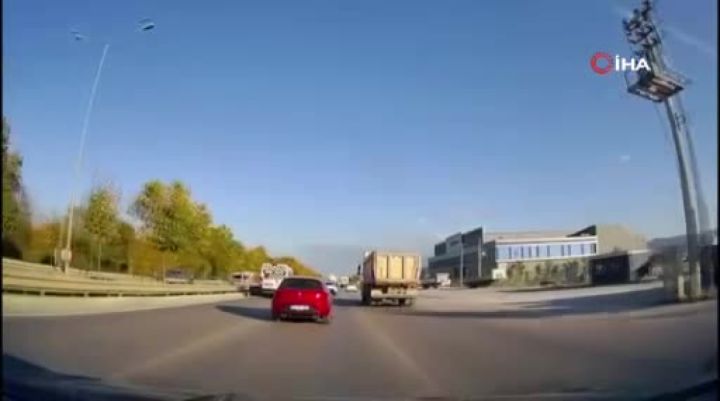 Bursa'da bir otomobilin makas atarak ilerleyen sürücü kazayı kıl payı atlattı. O anlar kameraya yansırken, polis olayla ilgili çalışma başlattı.