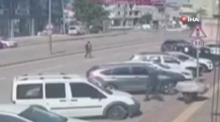 Bursa'da cadde üzerinde geri manevra yapan araç sürücüsü arkasından gelen yayı fark etmeyip çarptı. Savrulan yaya yaralanırken, aracın altında ezilmekten son anda kurtuldu. O anlar güvenlik kamerasına yansıdı.