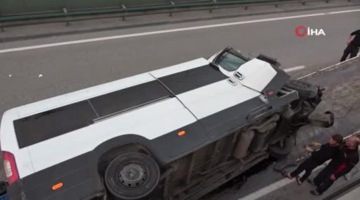 Bursa'da direksiyon hâkimiyetinin kaybedilmesiyle önce bariyerlere sonra öndeki minibüse çarpan minibüs devrildi. Devrilen minibüsün sürücüsü yaralandı.