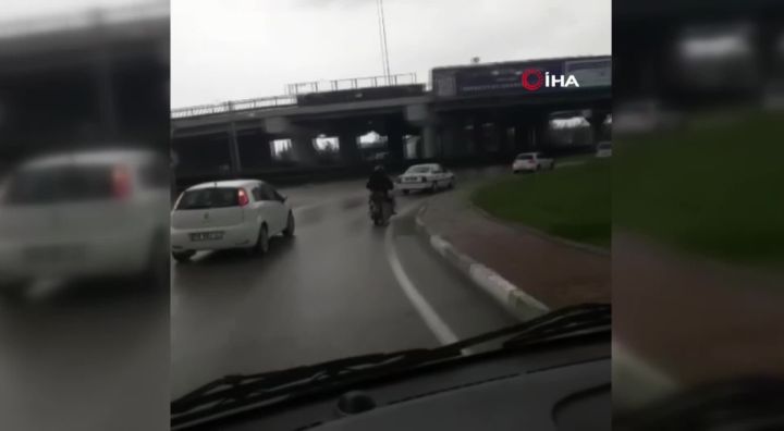 Olay, merkez Osmangazi ilçesi Akpınar Mahallesi Sanayi Caddesi üzerinde meydana geldi. Edinilen bilgiye göre, havanın yağmurlu olmasını umursamayan sürücü, motosiklet ile merdiven taşıdı. O tehlike anlar trafikteki başka bir sürücünün kamerasına yansıdı.
