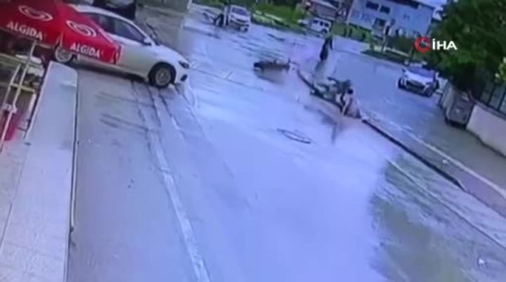 Bursa'da seyir halindeki motosiklet sürücüsü yağışlı havanın etkisiyle duramayarak, yolun karşısına geçen anne ve küçük çocuğuna çarptı. Yürekleri ağza getiren kaza görüntüsü bir işyerinin güvenlik kamerasıyla kaydedildi.