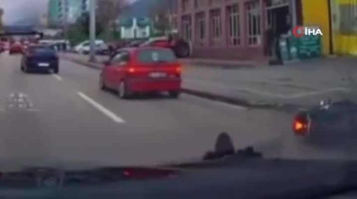 Bursa'da seyir halindeki motosikletli sürücü önündeki araca çarpmamak için ani manevra yapınca kontrolünü kaybedip yere düştü. O anlar kameraya yansıdı.