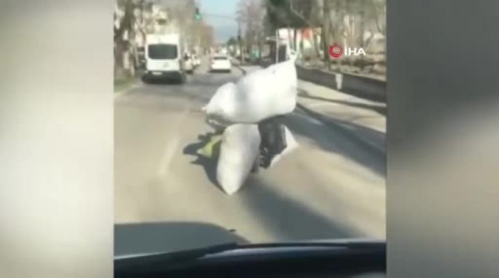 Bursa'da motosiklet ile tehlikeli şekilde yük taşıyan sürücü trafikte tehlike saçtı. O anlar cep telefonu kameralarına yansıdı.