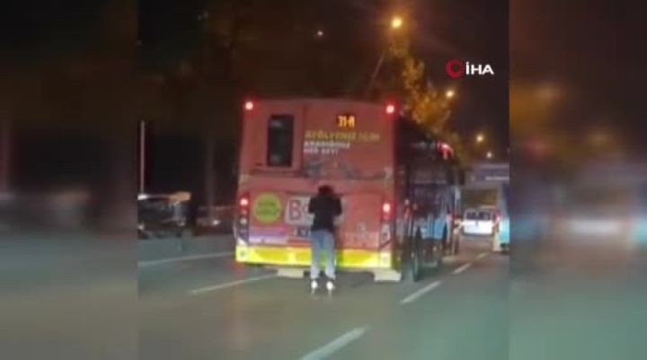 Bursa'da otobüsün arkasına tutunarak patenle yolculuk yapan genç, trafikte tehlike saçtı. O anlar cep telefonu kamerasına yansıdı.