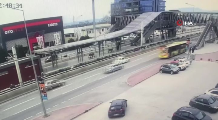 Bursa'da belediye otobüsünün bariyerlere çarpması sonucu 5 kişinin yaralandığı kaza, bir iş yerinin güvenlik kamerasına yansıdı.