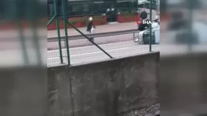 Bursa'da şiddetli rüzgarın etkisiyle devrilen mini otomobilde bulunan sürücü, çevredeki vatandaşların yardımıyla kurtarıldı.