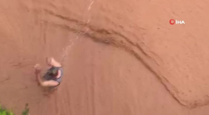 Bursa'da Meteoroloji Genel Müdürlüğü'nün uyarılarının ardından etkisini gösteren şiddetli yağmur bazı ilçelerde taşkına neden oldu. İznik ilçesinde ise bir vatandaş göle dönen sokakta yağmur sularıyla duş aldı.