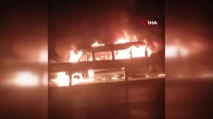 Bursa'da seyir halindeki servis minibüsü alev alev yandı, büyük bir faciadan dönüldü. O anlar ise kameraya anbean kaydedildi.
