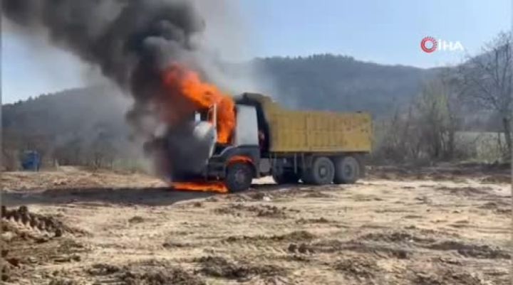 Bursa'nın İnegöl ilçesinde toprak taşıyan kamyon alev alev yandı. O anlar kamerayla kaydedildi.