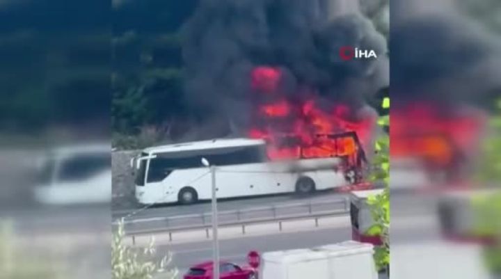 Bursa'da yolcu otobüsü seyir halindeyken alev alev yandı. Yolcular araçtan tahliye edilirken, itfaiye ekiplerince alevler kısa sürede kontrol altına alındı.
