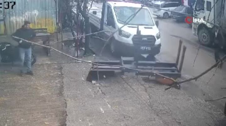 Bursa'da stajyer olarak çalışan öğrenci, transpaletin altında kaldı. O anlar kameraya yansırken, gencin yardımına arkadaşları yetişti.