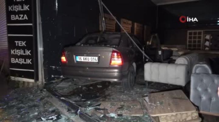 Bursa'da kontrolden çıkan araç mobilya dükkanına girdi. Otomobilde bulunan sürücü kazayı yara almadan atlattı.