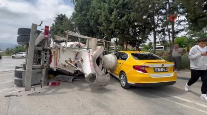 Bursa'da ticari taksi şoförü, virajı alamayarak devrilen çimento kamyonunun altında kalmaktan son anda yaptığı manevra sayesinde kurtuldu.