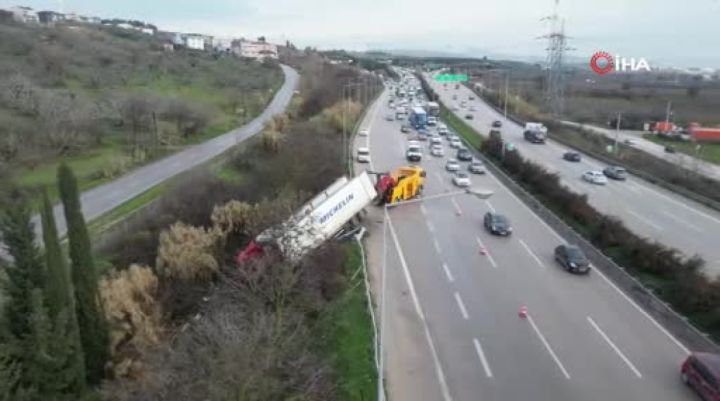 Bursa'da kontrolden çıkan tır refüje uçtu. Facianın teğet geçtiği kazada sürücü yaralanırken, otobanda trafik uzun kuyruklar oluşturdu.