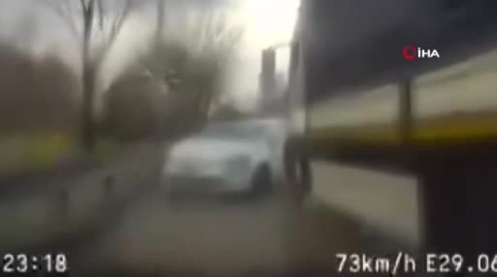 Bursa'da seyir halindeki otomobil şerit değiştirince tırın çarpmasıyla bariyerlere savruldu, kaza anı kameraya yansıdı.