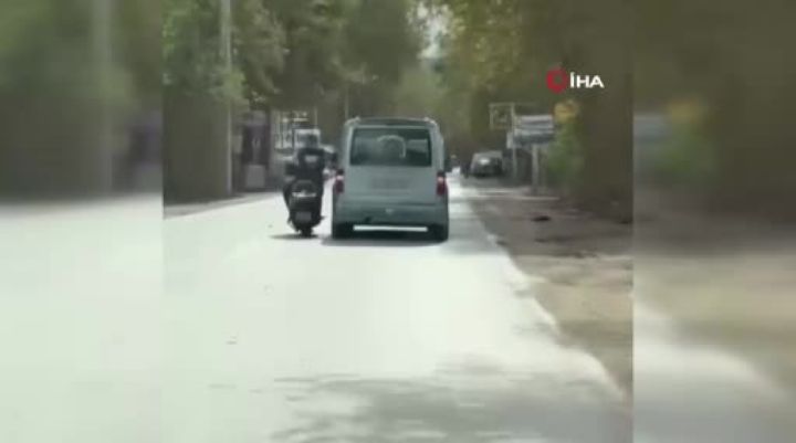 Bursa'da bir motosiklet sürücüsü seyir halindeki arkadaşıyla sohbet etmek için, bir elini seyir halindeki ticari aracın camına yasladı, diğer eliyle de motosikleti kullandı. Sürücülerin tehlikeli hareketleri kameralara yansıdı.