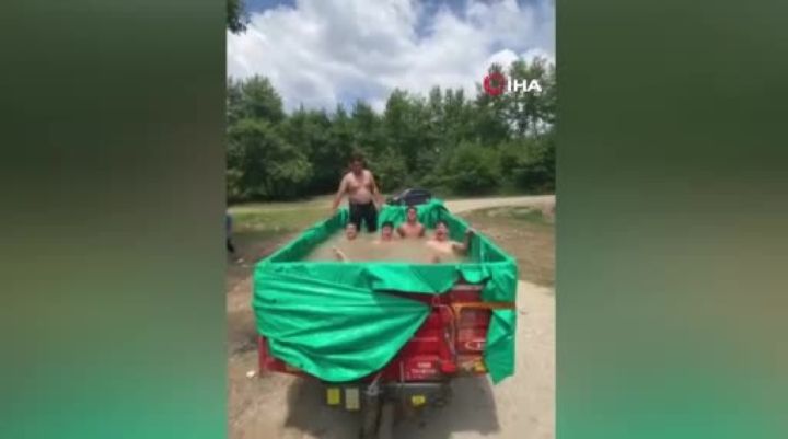 Bursa'nın İnegöl ilçesinde sıcaktan bunalan gençler, traktör römorkuna doldurdukları suyla serinledi.