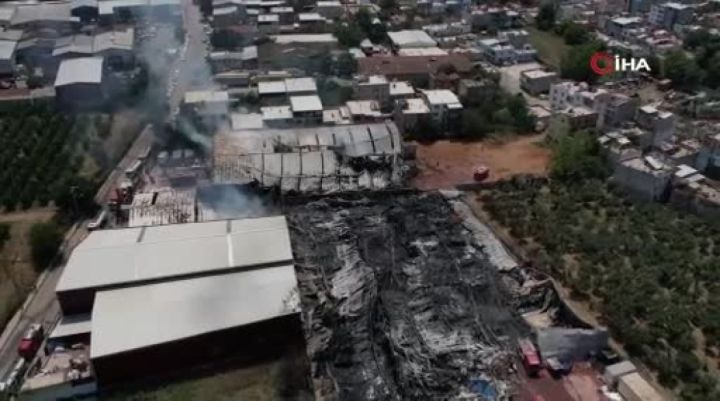 Bursa'da bir fabrikada başlayan ve kısa sürede 3 fabrikaya daha sıçrayan yangın kontrol altına alındı. Soğutma çalışmalarına devam edilen fabrikalar havadan dron ile görüntülendi.